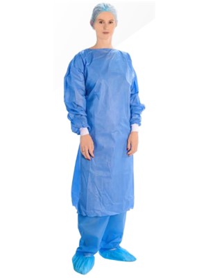 Mandilón largo (nivel por debajo de las rodillas) descartable, con cuello redondo, con amarre posterior con 02 lazos en el cuello y 02 lazos en la parte delantera, con uniones termoselladas y/o cosidas, de manga larga con puños ribb en las muñecas para mayor sujeción y protección, no tiene bolsillos, no traslucido (opacidad) y fresco.
