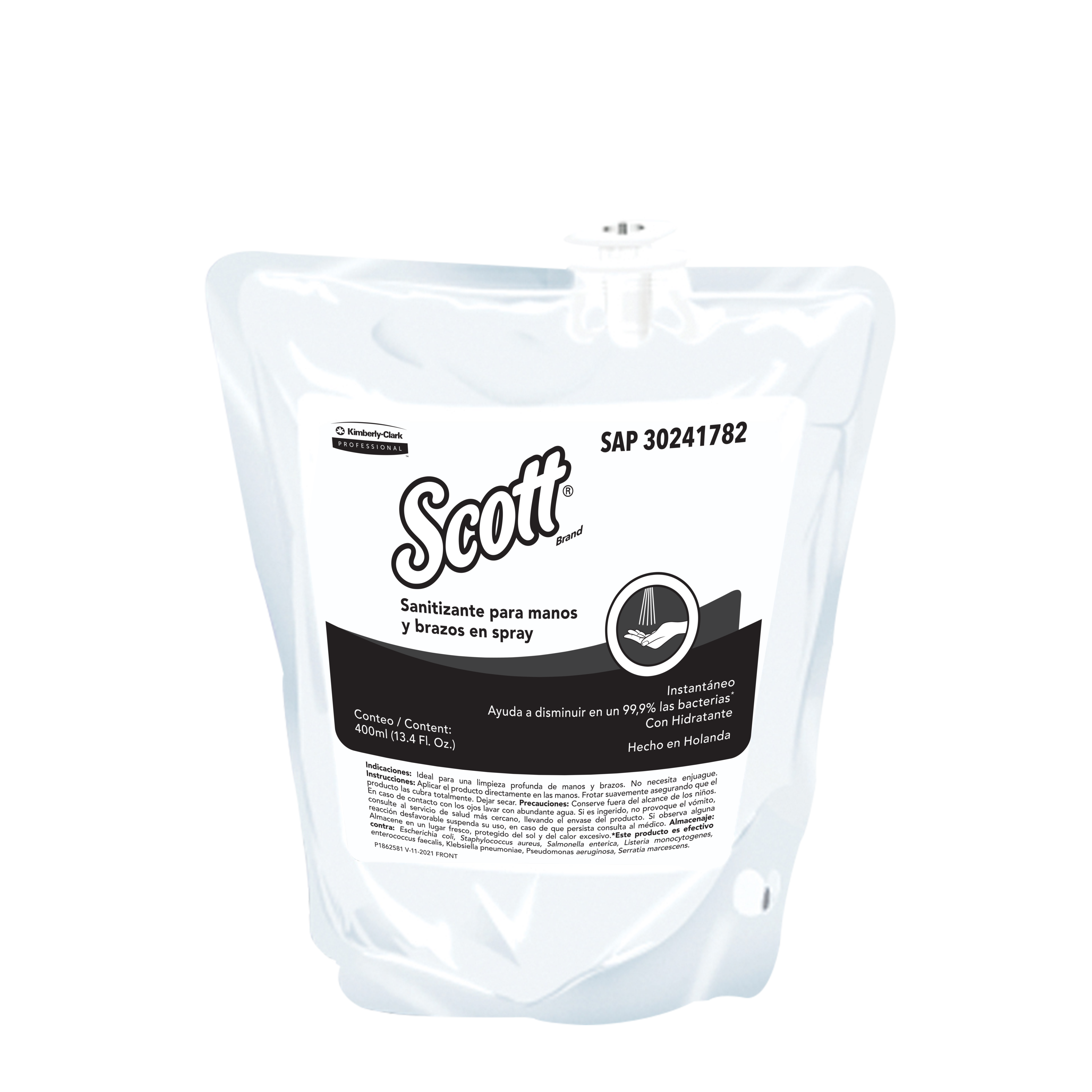 El Sanitizante en spray Scott® Essential te brinda higene & eficiencia, con acción instantánea, ayudando a disminuir en un 99.9% las bacterias.* *Este producto es efectivo contra: Escherichia coli, Staphylococcus aureus, Salmonella entérica, Listeria monocytogenes, enterococcus faecalis, Klebisiella pneumoniae, Pseudomos aeruginosa, Serratia marcescens. 12 repuestos x 400 ml